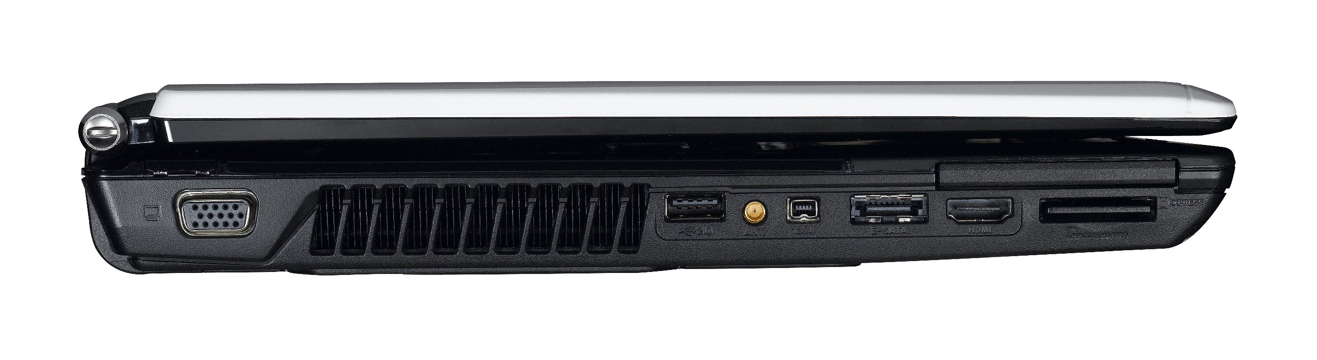 a gép bal oldalára került, meglehetősen összezsúfolva, ugyanis a további USB kapu mellett egy kombinált eSATA/USB csatlakozó, FireWire, HDMI, VGA kivezetések is itt találhatóak, valamint a beépített TV tuner