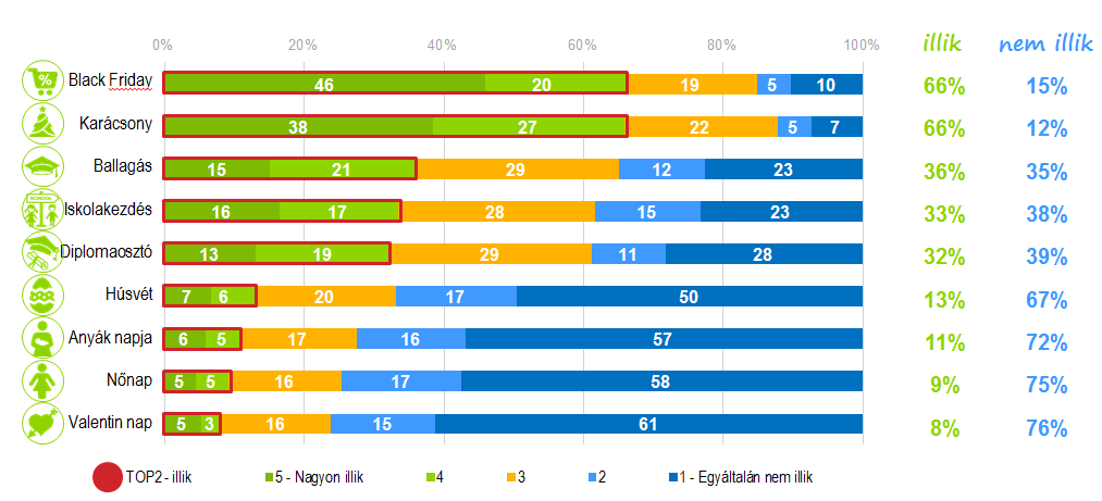 Inkább az év második feléhez, karácsonyhoz, illetve a Black Friday eseményhez kötik a legtöbben műszaki cikkek vásárlását. Arra a kérdésre ugyanis, hogy az egyes akciós időszakokhoz mennyire illik a műszaki cikkek vásárlása a válaszadók túlnyomó többsége az előbbi kettőt, illetve a ballagást és az iskolakezdést említette. A Valentin nap, az anyák napja, a nőnap és a húsvét igen alacsony százalékokat ért el.