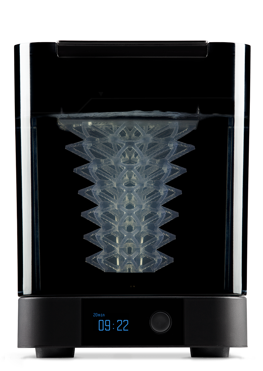 Korábban az SLA nyomatok utókezelésének munkafolyamata azzal kezdődött, hogy a nyomatot el kellett távolítani a nyomtatótálcáról, majd a Form 2-höz csomagolt Finish kit kádjaiban manuálisan kellett róluk lemosni izopropil alkohollal (IPA) a felesleges műgyantát. A legjobb eredményt akkor kaptuk, ha szemünket az órán tartva az adott anyagnak megfelelő ideig fürdettük a modelleket.